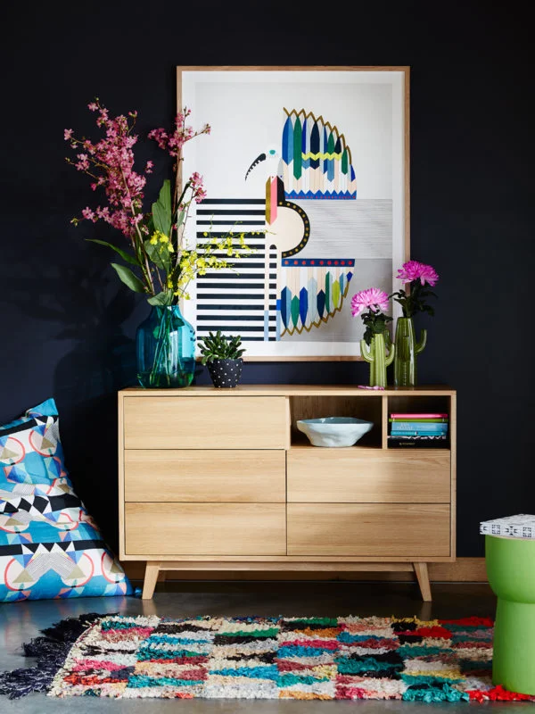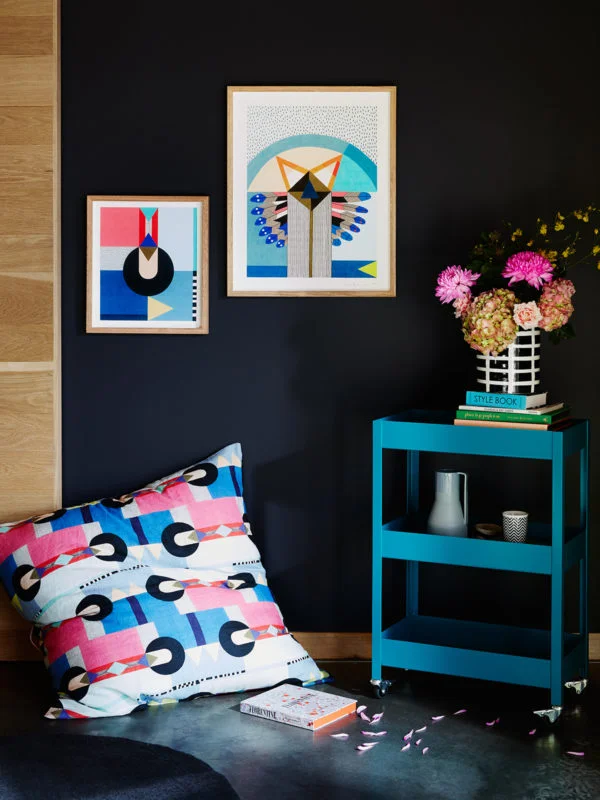 Lisa Lapointe artwork and soft furnishings. Photo – Armelle Habib. Styling – Julia Green of Greenhouse Interiors.