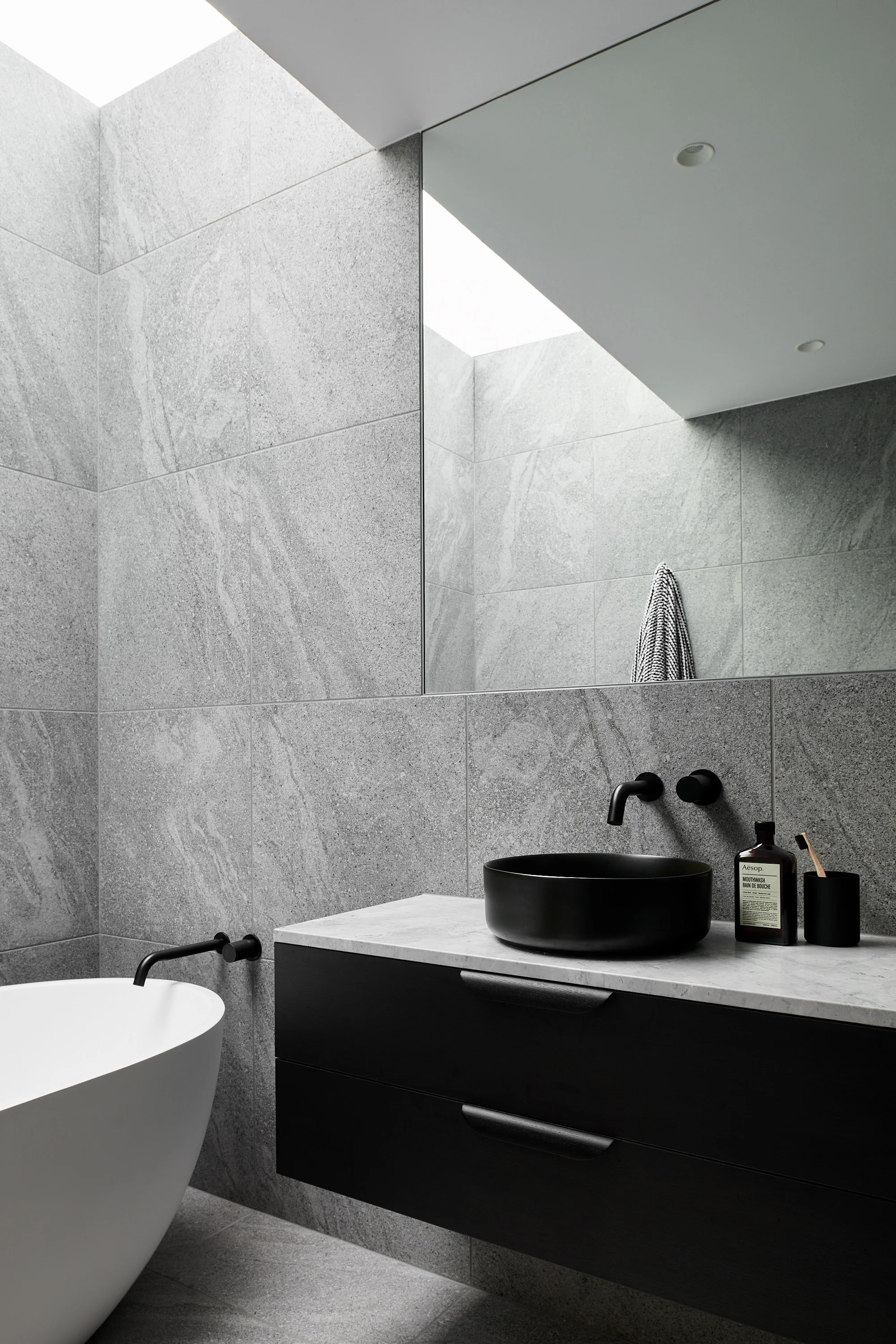 We are so excited that it’s bathroom week and that also means that we are officially halfway through revealing The Albert Park Project! When designing the bathrooms we were considerate of the houses minimal aesthetic and because of that we chose a large format textured grey tile for all bathrooms/wet areas and paired it with black tapware, black vanities, super white marble bench tops and black basins… there was to be no chrome in the making of these bathrooms! Episode #3 focuses on the family bathroom, pictured below there is a shot of a shower from one of the ensuite’s and to check out the powder room click here - as you can see we kept all the bathrooms the same for design continuity!