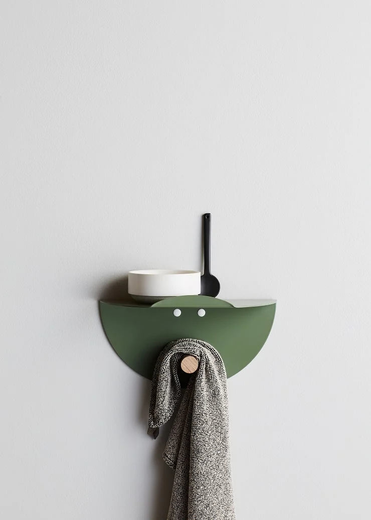 Tuck Floating Shelf – A versatile floating shelf folded from powder-coated steel and featuring a Tasmanian oak peg. Available in White and Moss.