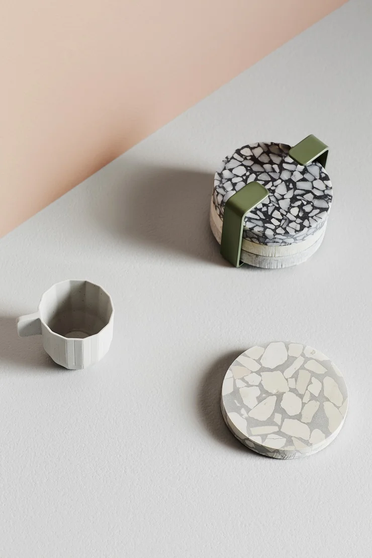 Omni Terrazzo Trivet Set – Omni is a set of four assorted Fibonacci Terrazzo Trivets created exclusively with Sly. Housed in a Moss steel cuff, each trivet has a unique colour, pattern and chip size.